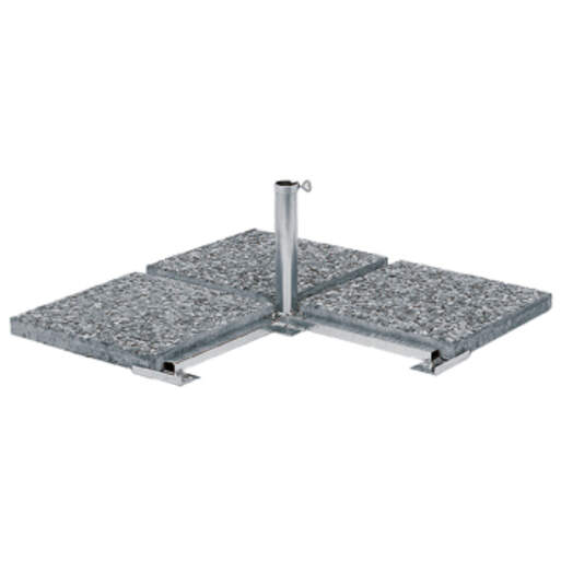 The plate stand takes just a few steps to assemble. Stone or concrete slabs (50x50 cm) can be used as weights. These are not included in the delivery. With plates, the stand weighs approx. 125kg. It’s suitable for umbrellas from 3.5 x 3.5m. (Pole diameter 60mm)